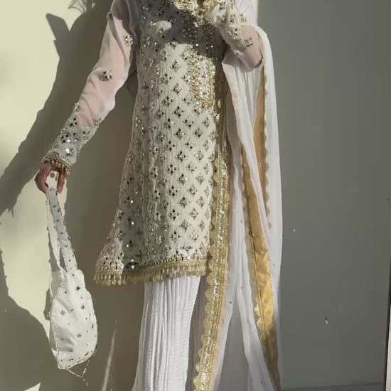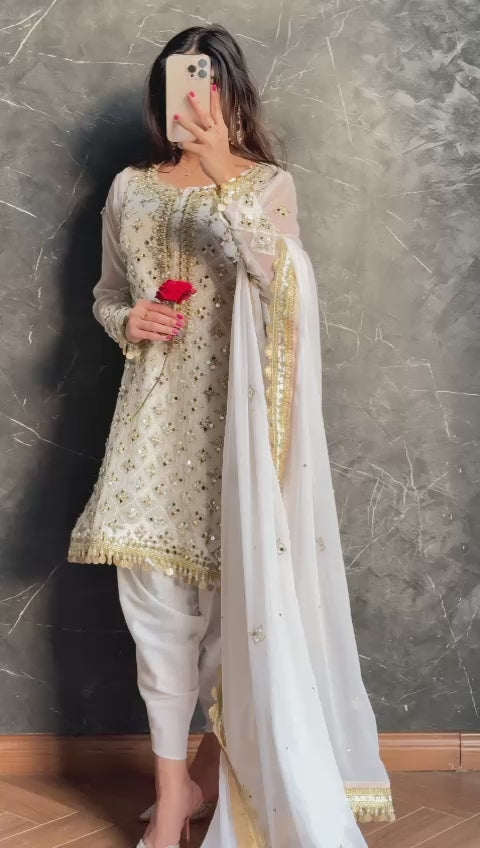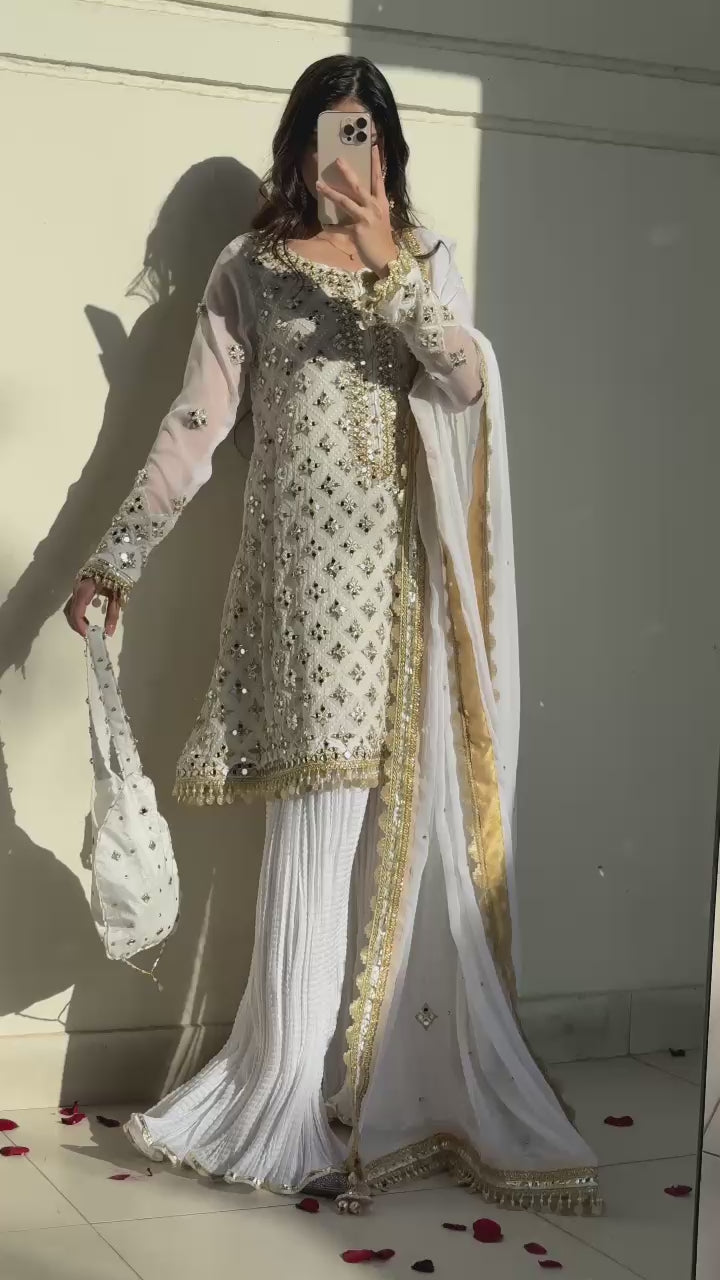 White Chikankari Mirror Work Suit – Handcrafted Zari Embellished Shirt with Tulip Shalwar / Crush Sharara & Chiffon Dupatta