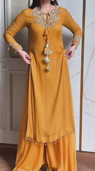 Amber Glow – Hand Embellished Mustard Chiffon Ensemble