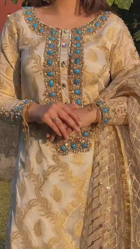 Elevate your festive wardrobe with Golden Aura, a mesmerizing ivory and gold jacquard ensemble adorned with turquoise stonework and zari embroidery. This three-piece set exudes grace and refinement — perfect for celebrations where elegance meets effortless luxury.