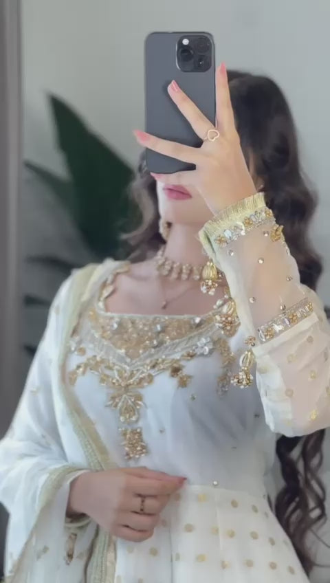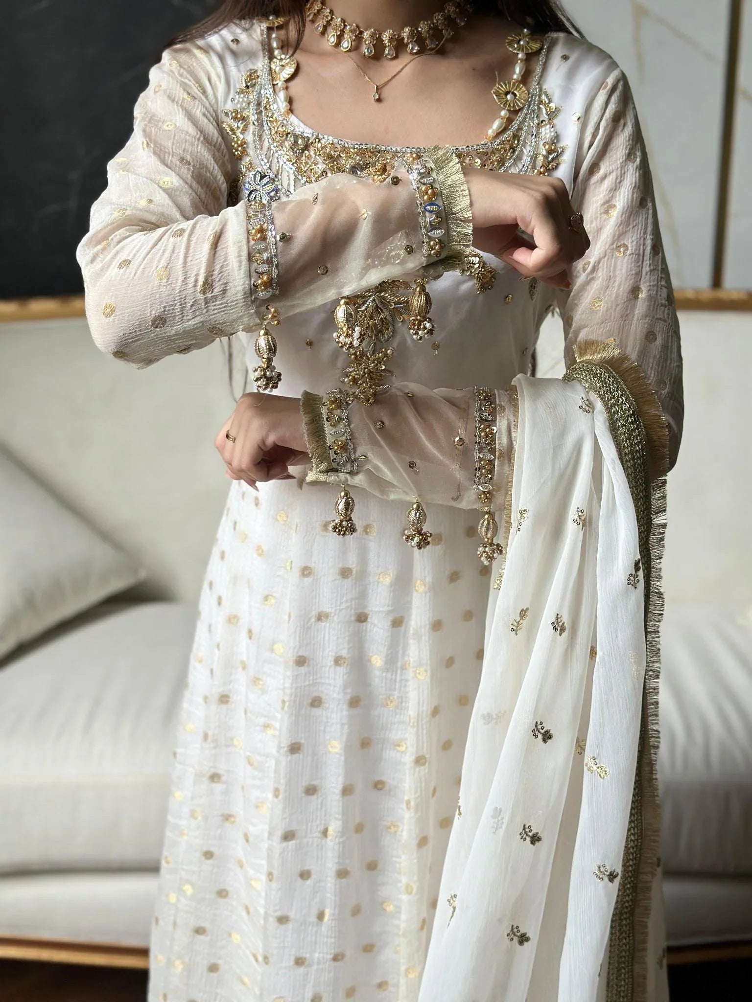 Paired with a matching embroidered chiffon dupatta and jamawar trousers, this ensemble embodies understated sophistication and grandeur — ideal for weddings, receptions, or festive gatherings.