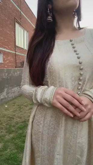 Radiate understated elegance in Ivory Royale, a stunning jacquard ensemble paired with a luxurious Banarasi dupatta. The soft ivory tone beautifully complements the deep maroon and gold contrast, creating a timeless festive look — ideal for celebratory gatherings and elegant evening affairs.