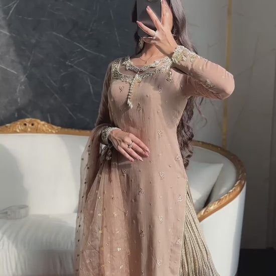 Step into timeless elegance with this nude beige embellished Anarkali suit, designed to exude grace and sophistication. The outfit features a beautifully embroidered net overlay adorned with delicate sequins and beadwork, adding a subtle shimmer perfect for festive occasions or formal gatherings.