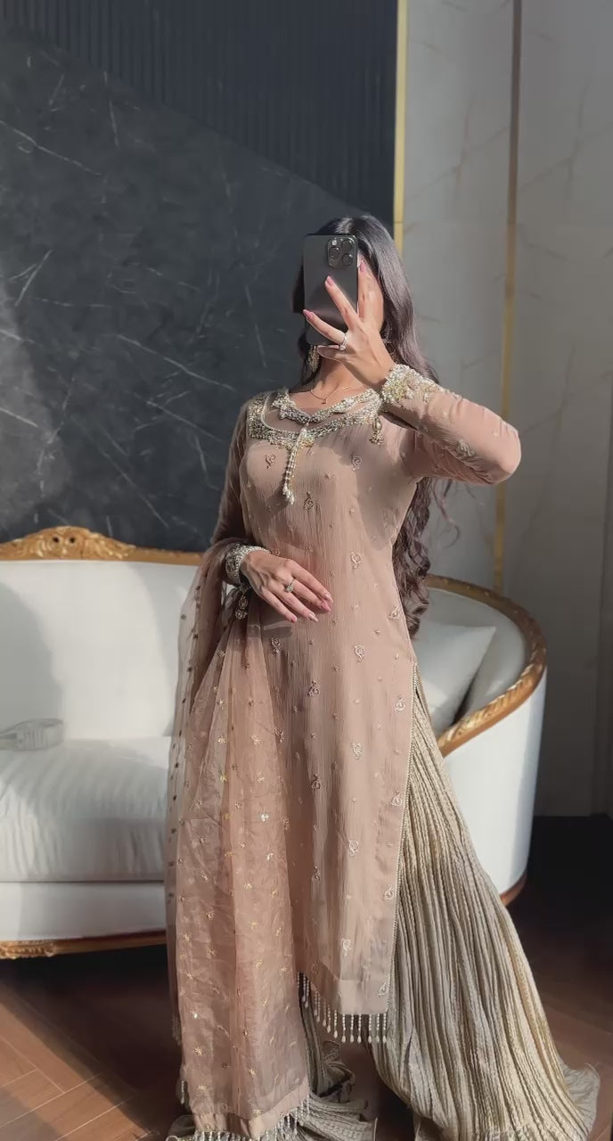 Elegant Nude Beige Embellished Net Anarkali Suit with Pleated Gold Skirt