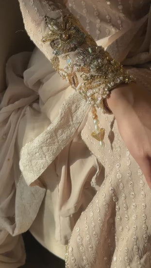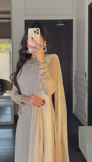 Experience timeless elegance with our Nude Chiffon Hand-Embellished 3-Piece Suit, crafted to perfection for festive events, weddings, and formal gatherings. The outfit features a soft nude chiffon base, delicately hand-embellished with sequins, pearls, and intricate threadwork.
