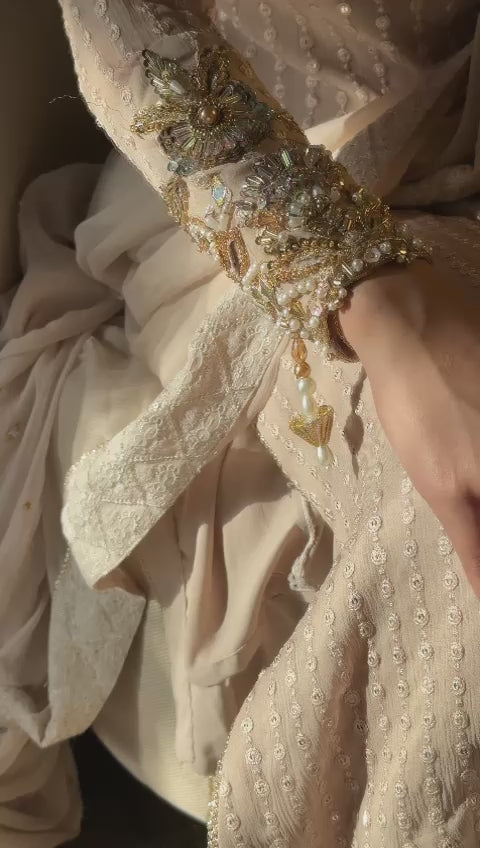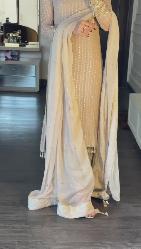 Luxury Nude Chiffon Hand-Embellished Suit – Embroidered Shirt, Trouser & Chiffon Dupatta